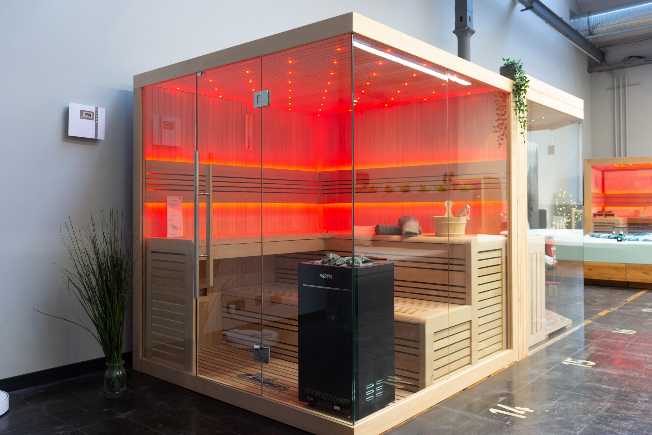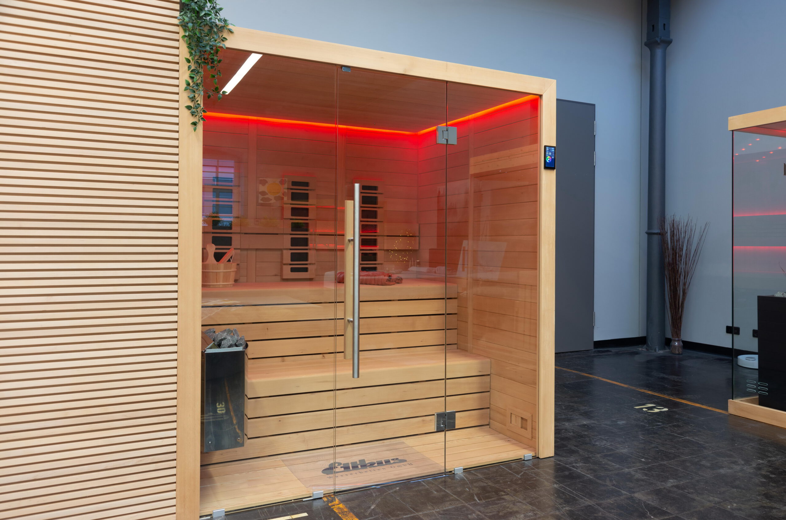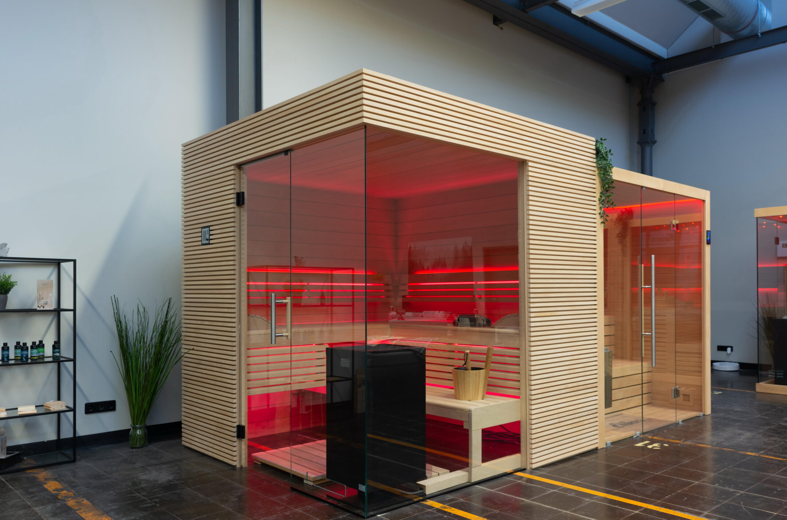 Element-Saunen mit finnischem Ofen und/oder Infrarot-Strahlern aus massivem Hemlockholz